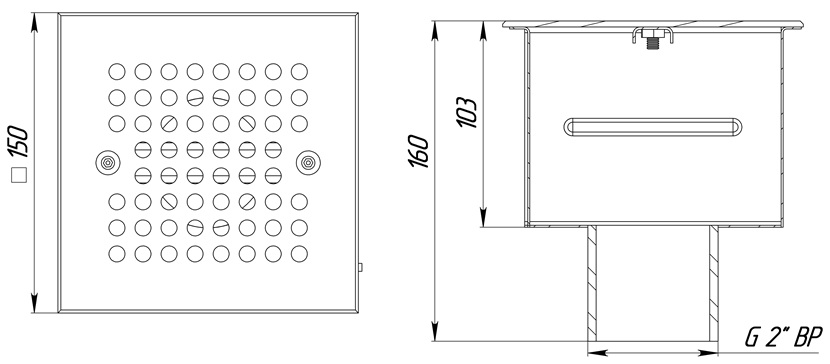 Присоединение - внутренняя резьба 2". Крышка за счет увеличенного размера скрывает примыкание и возможные дефекты подрезки плитки (мозаики).
