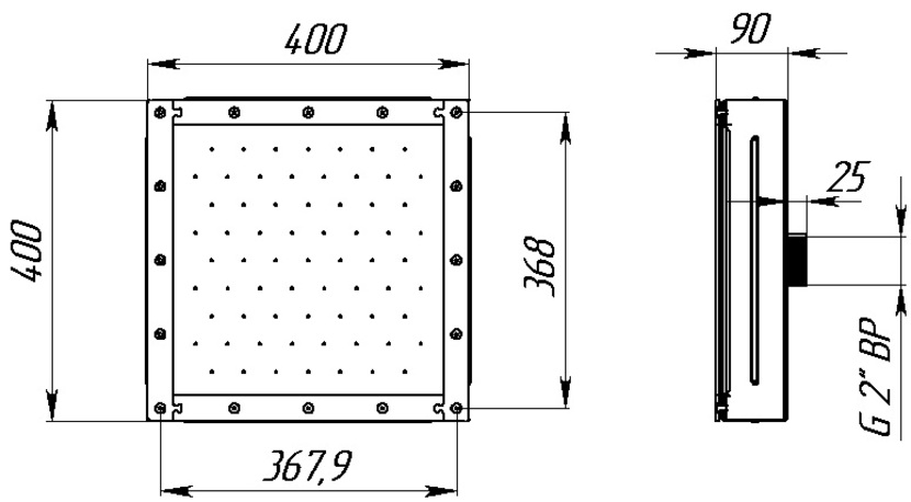 Гейзер 400х400 для пленочного  бассейна  представляет собой стальное решетчатое плато.  Гейзер рассеивает нагнетаемый воздух, в результате чего образуется множество пузырьков, производящий мягкий массаж. Они поднимаются из толщи воды и создают эффект бурления. Изготовлены из полированной нержавеющей стали AISI 316.