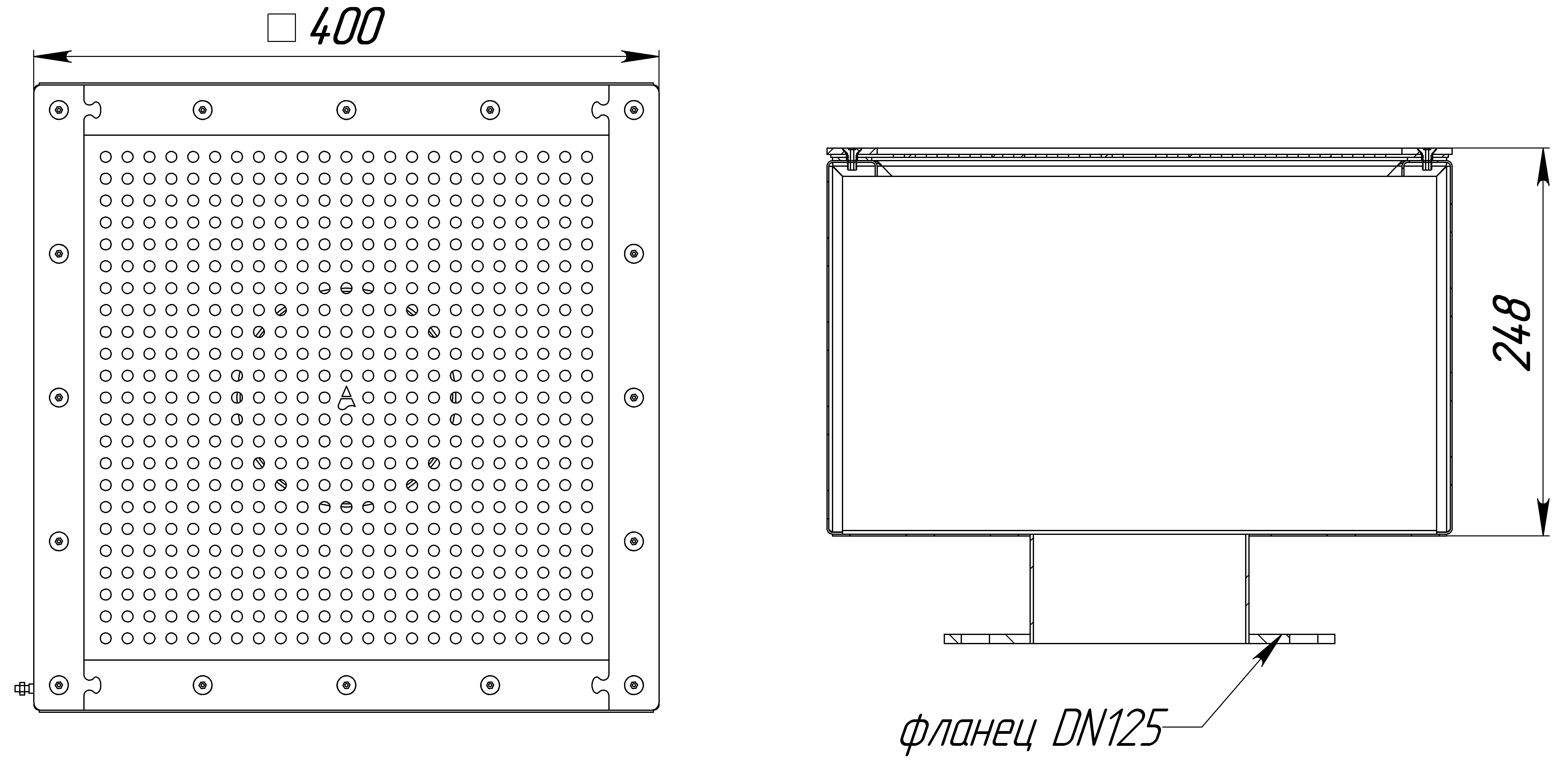 Присоединение - фланец DN 125. Комплектуется прижимным фланцем, уплотняющей прокладкой и винтами.