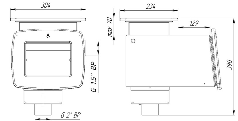 Монтируется в стену.  Присоединение к фильтру - внутренняя резьба G 2’’ BР, к аварийному переливу - внутренняя резьба G 1,5" ВР.